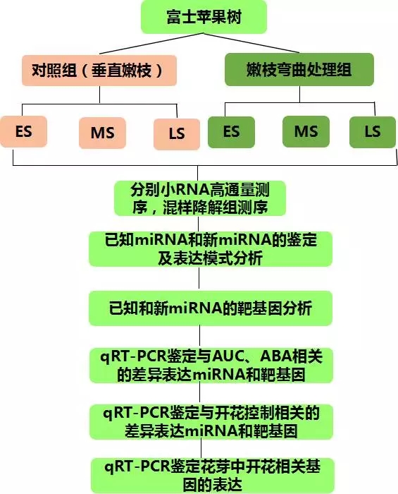 生長六年大小的富士蘋果樹,分兩組進行嫩枝彎曲(110度)、對照處理(垂直嫩枝),分別在開花誘導的初期(early stage,ES)、中期(Middle stage,MS)和晚期(Later stage,LS)取花芽,分別提取RNA進行小RNA測序,6個花芽組織RNA混樣進行降解組測序。