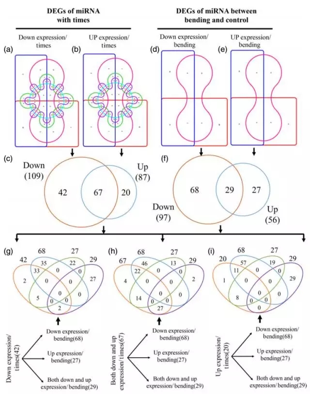 用栽培種蘋果(Malus domestica Borkh)作為參考基因組來預測潛在的新miRNA,共鑒定到137個新miRNA。對同一處理不同發(fā)育時期樣品間(CMS vs CES, CLS vs CMS, CLS vs CES, BMS vs BES, BLS vs BMS and BLS vs BES)新miRNA進行差異表達分析并繪制了維恩圖。結(jié)果顯示,其中34個新miRNA隨著發(fā)育時期上調(diào)表達,24個新miRNA在嫩枝彎曲處理組表達高于對照組,23個新miRNA在對照組表達明顯高于嫩枝彎曲處理組。