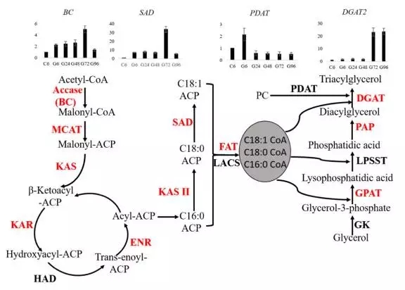 藻類和植物中脂肪酸的生物合成主要在葉綠體中進(jìn)行。乙酰-CoA作為合成的起始物質(zhì)?;谵D(zhuǎn)錄組測(cè)序,小球藻質(zhì)體中脂肪酸合成基因被鑒定到。在葡萄糖處理情況下,這些基因大都表達(dá)量上調(diào)。另外這次測(cè)序結(jié)果中還發(fā)現(xiàn)幾個(gè)基因?qū)?yīng)的不同轉(zhuǎn)錄本。由于BC和SAD是脂肪酸合成的限速酶基因,做了進(jìn)一步分析,發(fā)現(xiàn)BC和SAD表達(dá)量從6h到72h表達(dá)量持續(xù)上升,對(duì)應(yīng)的三酰甘油含量從24h到96h持續(xù)增加。