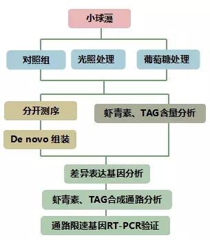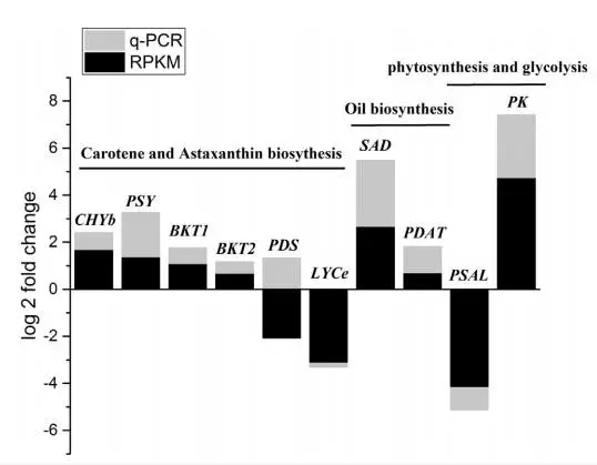 作者選了10個(gè)與蝦青素和三酰甘油合成有關(guān)的unigenes進(jìn)行了RT-PCR驗(yàn)證,其中9個(gè)基因的表達(dá)趨勢(shì)與RNA-seq結(jié)果一致。只有PDS兩種結(jié)果不同,可能是RNA-seq結(jié)果不準(zhǔn)確,因?yàn)榍叭说难芯砍晒?,葡萄糖是上調(diào)PDS表達(dá)的,與本文中RT-PCR結(jié)果一致。