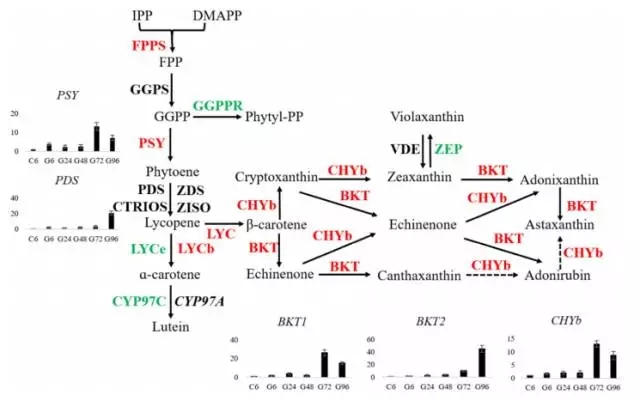 在轉(zhuǎn)錄組測(cè)序結(jié)果中,發(fā)現(xiàn)MEP通路中的8個(gè)基因都被鑒定到,但是在MVA通路中只有2個(gè)基因被檢測(cè)到,其中HMG表達(dá)不顯著,ACAT表達(dá)量下降。這些結(jié)果表明小球藻中蝦青素的合成通路中IPP和DMAPP是MEP通路合成的。其中,發(fā)現(xiàn)一個(gè)可能編碼β-胡蘿卜素激酶(BKT2)與數(shù)據(jù)庫(kù)中的BKT1比對(duì)率僅為56%。功能分析發(fā)現(xiàn)BKT2可以轉(zhuǎn)化β-胡蘿卜素成為角黃素。下圖為蝦青素合成通路圖。在葡萄糖處理情況下,與蝦青素合成相關(guān)的6個(gè)基因上調(diào)差異表達(dá)。在小球藻中,葡萄糖誘導(dǎo)蝦青素的合成,伴隨著B(niǎo)KT1,CHYb,PDS在24h內(nèi)上調(diào)表達(dá)。為研究轉(zhuǎn)錄組水平基因表達(dá)量與產(chǎn)物含量的關(guān)系,分析了5個(gè)限速基因的表達(dá)量,這些基因在葡萄糖處理72h或92h表達(dá)量達(dá)到最高,相應(yīng)的,蝦青素的積累量也在96h達(dá)到穩(wěn)定水平。