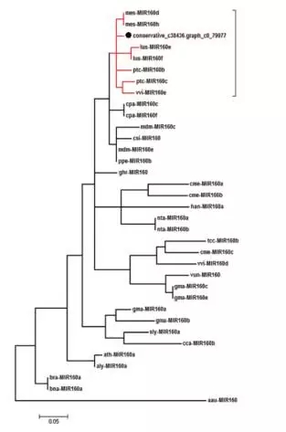 將成熟的miRNA比對到植物的ncRNA Database鑒定到19個(gè)miRNA。以MIR160家族為例進(jìn)行系統(tǒng)進(jìn)化分析:基于pre-miRNA序列來構(gòu)建MIR160家族系統(tǒng)進(jìn)化樹。結(jié)果顯示保守的c38436.graph_c0_79977與來自葡萄、楊樹、木薯和蓮花的MIR160形成了一個(gè)分枝,這也與山茶花的進(jìn)化地位相一致。