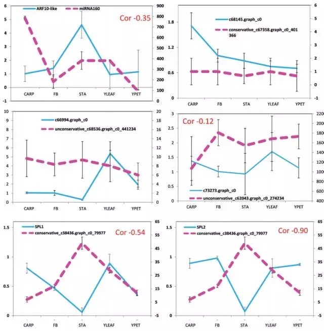 選取6個(gè)miRNA及其靶基因進(jìn)行表達(dá)驗(yàn)證,發(fā)現(xiàn)4對表現(xiàn)出負(fù)相關(guān)的關(guān)系。例如miRNA167靶向2個(gè)SPL基因,用qPCR進(jìn)行驗(yàn)證,結(jié)果顯示出強(qiáng)的負(fù)相關(guān)關(guān)系。