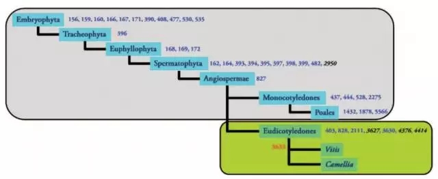 (1).為了鑒定山茶花中家系特異miRNA家族,對不同植物中的miRNA家族構(gòu)建進(jìn)化樹。發(fā)現(xiàn)2個(gè)葡萄特異的miRNA家族出現(xiàn)在山茶花中,其中miR3633是高豐度和高識別度的,表明它出現(xiàn)在葡萄和山茶花分化之前。