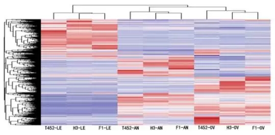 圖2:所有基因的層次聚類分析。AN:花藥;OV:子房;LE:葉片。