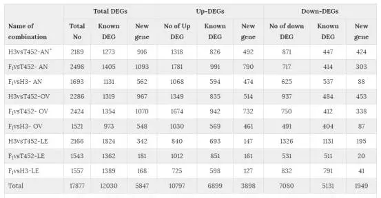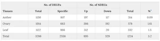 表2:三個(gè)不同組織中的差異表達(dá)基因統(tǒng)計(jì)。AN:花藥;OV:子房;LE:葉片。