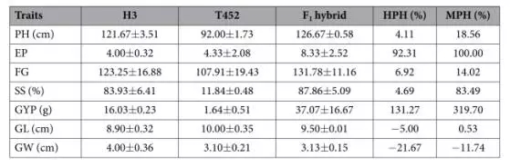 表一:T452與H3雜交F1代的雜種優(yōu)勢。HPH:高親優(yōu)勢;MPH中親優(yōu)勢;PH:植株高度;EP:單株谷粒數(shù);FG:單花谷粒數(shù);SS:結(jié)實(shí)率;GYP:單株產(chǎn)量;GL:10谷粒長度;GW:10谷粒寬度。