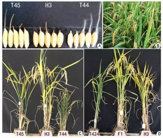 圖1:親本和雜交F1代的表型。(A)Jackson-4x(T45),Huaduo 3(H3)與96025(T44)的谷粒大小,H3是來自T45和T44的雜交;(B)H3在大田中的長勢;(C)T45,H3,T44的植物表型;(D)Shennong15-4x(T424),H3,以及兩者雜交F1代的表型。