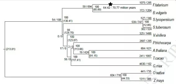 苦蕎與擬南芥、可可、大豆、葡萄、楊樹、馬鈴薯、番茄以及單子葉的水稻和玉米構(gòu)建系統(tǒng)發(fā)育進化樹,見下圖。此外還進行基因家族聚類分析,找出共同和特有的基因家族。