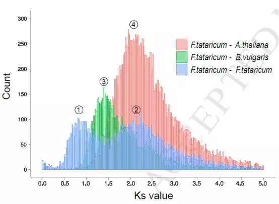 通過苦蕎與擬南芥、苦蕎與甜菜進行分析,通過Ks計算發(fā)現(xiàn)苦蕎經(jīng)歷了全基因組復制事件,近期是在下圖0.84-0.92之間,而更古老的一次復制發(fā)現(xiàn)在64.42~70.77 Mya。而全基因組復制事件的發(fā)生,也導致了很多與抗逆相關基因家族的擴張或者保留。這也與后期苦蕎的抗逆性有一定關系。