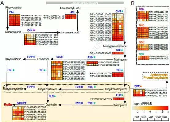 蘆丁的生物合成具有特殊的意義,而苦蕎被認為是這種有益的類黃酮的主要食物來源。苦干蕎麥營養(yǎng)生物質(zhì)中含有3%的蘆丁。通過比較基因組以及不同生長部位的轉(zhuǎn)錄組測序,發(fā)現(xiàn)原來所不知道的全長蛋白CHI(FtPinG0002790600)和f3h(FtPinG0006662600)。