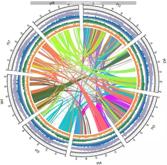 苦蕎通過K-mer預估基因組大小約為489Mb,流式細胞儀預估為540Mb。共組裝出來489.3Mb的基因組序列,共8778個Contigs,Contig N50=550.7kb。通過Hi-C數(shù)據(jù)將436.4Mb的序列錨定到8條染色體上(定位比例為89.18%)。然后再通過光學圖譜數(shù)據(jù)進行校正。三代數(shù)據(jù)的準確性通過二代評估為99.96%,并且在基因區(qū)具有更少的錯誤存在。