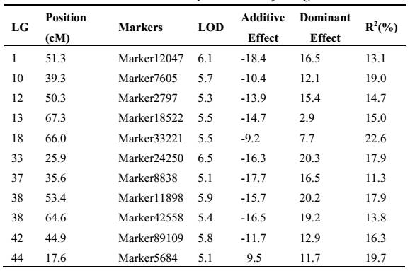 利用區(qū)間作圖法,定位到體重和體長QTL共11個,共可解釋表型變異為38.56%。其中位于連鎖群33標記24250位置的QTL解釋表型變異達到17.9%,LOD值為6.5,為一主效QTL。