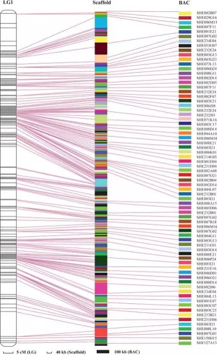 白對蝦是一個高雜合物種,其基因組含有80%的重復序列,其基因組組裝是一個很大的難題。本研究通過對遺傳圖譜、白對蝦初步組裝的Scaffold、BAC測序的序列進行共線性比較,最終使得5922個標記錨定到5885個Scaffold上,有利于后續(xù)白對蝦的基因組組裝。