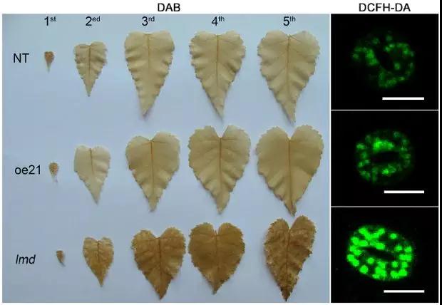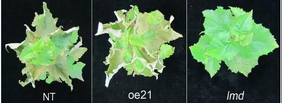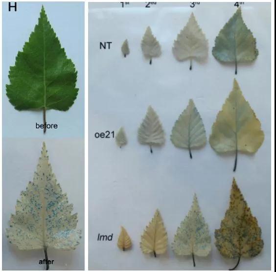 作者在研究BpGH3.5在樺樹中的功能時偶然獲得了lmd突變體。構建的21株OE-GH3.5株系中,唯獨lmd葉片表現(xiàn)出壞死斑點并伴有早衰的現(xiàn)象。這很明顯是一種病變的表現(xiàn),當這種情況出現(xiàn),很顯然我們要思考兩個問題:
