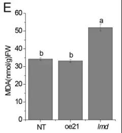 類病變突變體通常會表現(xiàn)出自發(fā)性的細胞程序性死亡(PCD),作者通過伊文思藍染色比較了lmd與NT、oe21的細胞死亡情況(圖4);丙二醛含量檢測間接反映了lmd細胞損壞程度也更高(圖5);