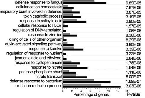 為了深入了解lmd體內(nèi)的分子水平變化,作者進行了轉(zhuǎn)錄組測序。對差異基因進行分析發(fā)現(xiàn)了許多與致病相關的基因,如WRKY、谷胱甘肽-轉(zhuǎn)移酶(GST)、乙烯反應因子(ERF)和絲氨酸/蘇氨酸蛋白激酶(serine/threonine-protein kinase),這些都已經(jīng)被研究證實與防御反應相關。GO富集分析顯示,參與催化活性、抗氧化活性、免疫系統(tǒng)過程和刺激響應的差異基因發(fā)生了顯著富集(圖9)。