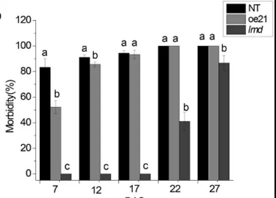 研究發(fā)現(xiàn)類病變突變體增強了對病原菌的抗性,為了測試lmd突變體是否對Alternaria alternata有抗性,作者將孢子懸浮液噴灑在NT、oe21和lmd幼苗上。7天之后,NT和oe21感染嚴重,出現(xiàn)了幾片枯萎葉片,而在lmd突變體中觀察到的枯萎葉片很少,盡管其葉片上有許多病變(圖11)。噴施17天后,NT和oe21的發(fā)病率均在90%以上,但lmd仍未出現(xiàn)感染葉片。lmd的發(fā)病時間出現(xiàn)在噴灑后22天,而此時,lmd的發(fā)病率為45.55%,但NT和oe21的發(fā)病率均為100%(圖12)。