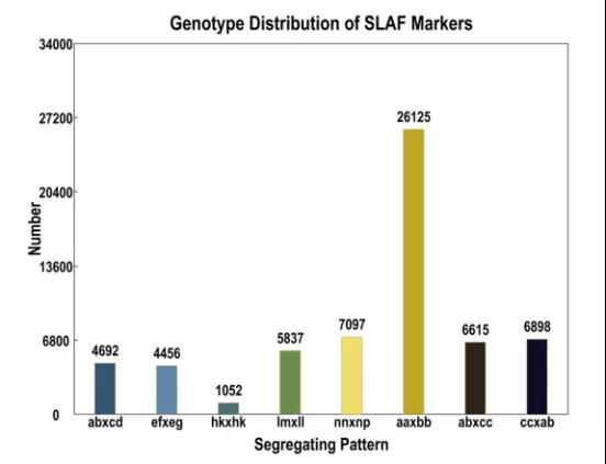 生物信息學(xué)分析,父本產(chǎn)生249076個SLAF標簽,母本產(chǎn)生279416個SLAF標簽,平均深度分別為32.62×和20.53×。對于F1作圖群體,每個個體平均產(chǎn)生190361個SLAF標簽,平均深度為8.80×。其中62772個多態(tài)性SLAF標簽用于基因分型(圖1)。除aa×bb類36647個SLAF標記被用于圖譜構(gòu)建,適合F1群體的后期連鎖圖譜構(gòu)建,有效多態(tài)性率為7.99%。