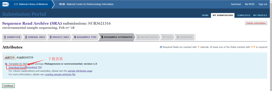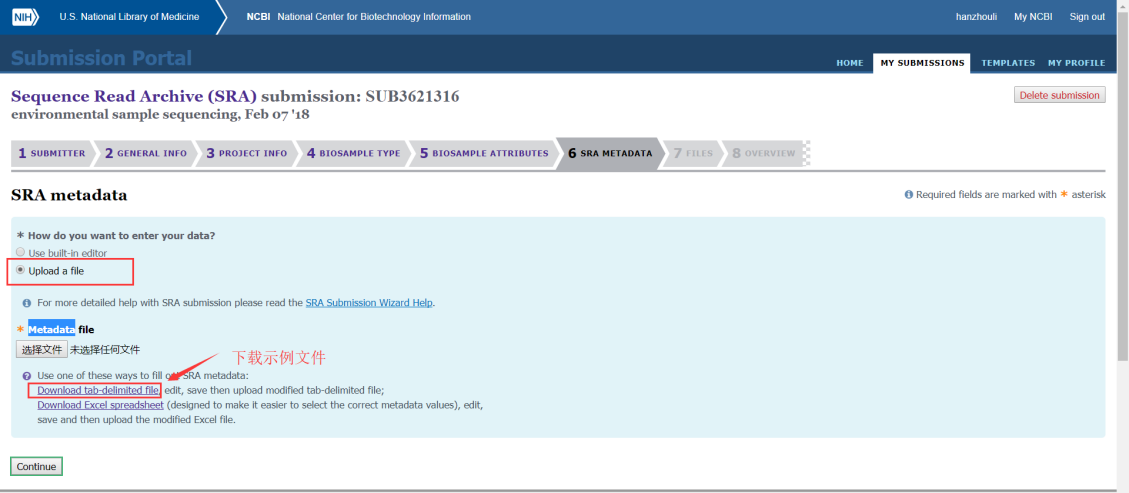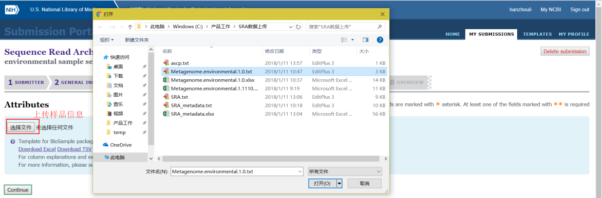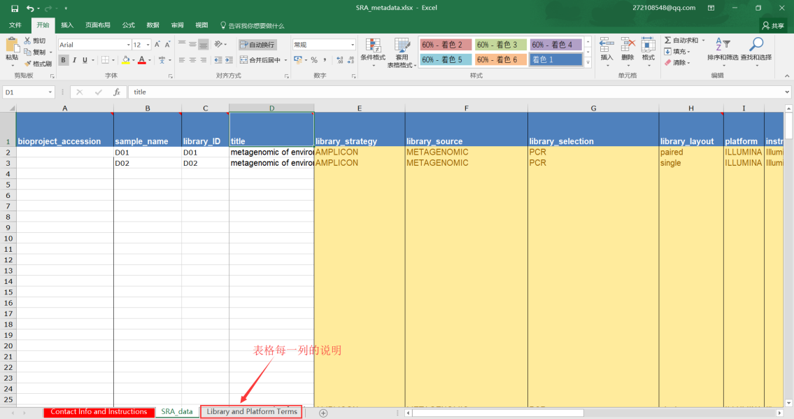 第七步:第六步表格上傳完成后,需要接著上傳Metadata表格,主要填寫樣品建庫測序的信息和需要上傳的文件名,填寫完成后也是導(dǎo)入到文本文件中然后上傳;