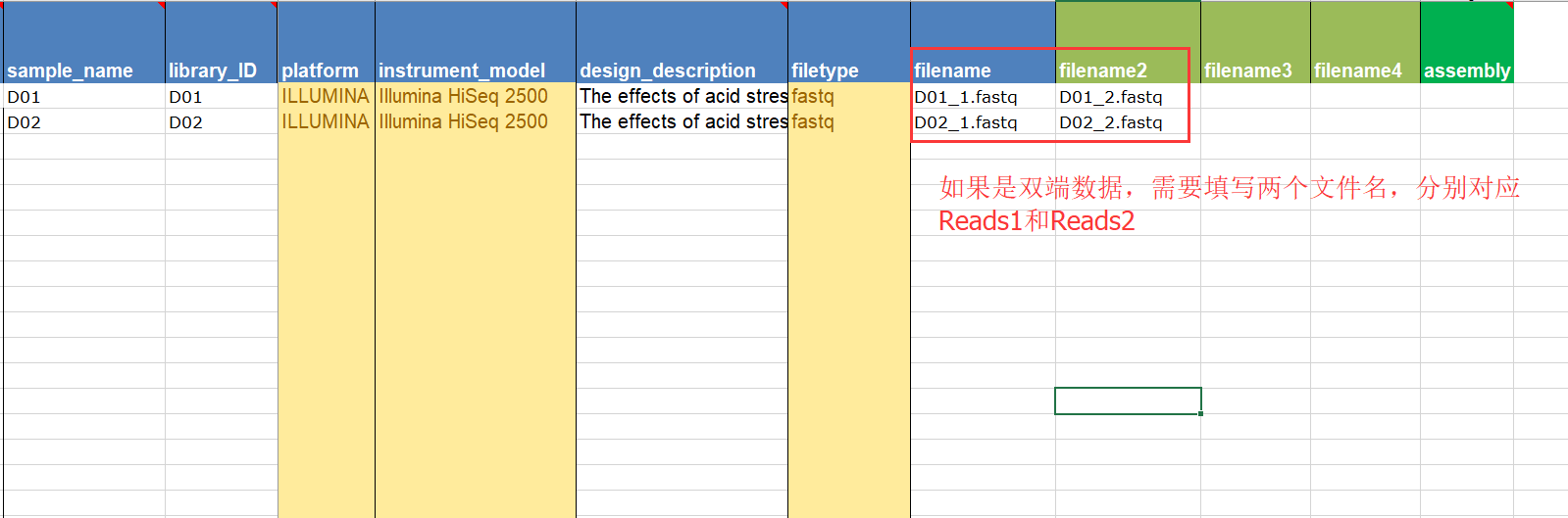 第六步:樣本具體信息,需要我們下載表格填寫,表格中綠色的為必填,藍色的需要至少填一個,其它內(nèi)容可以選填或者不填寫,如果是生物學(xué)重復(fù)需要添加一列replicate,填寫完成后需要將信息粘貼到文本文件中(TXT格式),然后上傳到網(wǎng)站上;