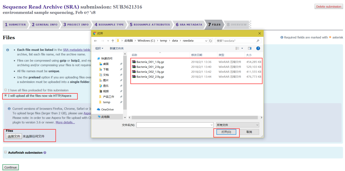 第八步:重點來了,這一步是將我們的數(shù)據(jù)傳到NCBI的服務(wù)器上,需要下載安裝一個軟件Aspera(http://downloads.asperasoft.com/connect2/,windows下也可以安裝)。軟件安裝完成后有兩種上傳方法:(1)可以直接上傳,適用于數(shù)據(jù)量小、樣本量小的項目;
