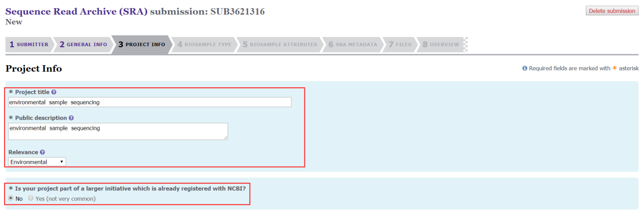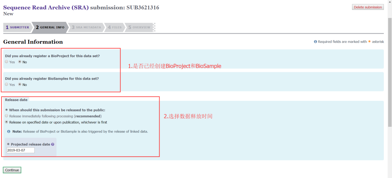 第三步:填寫B(tài)ioSample、BioProject和數(shù)據(jù)釋放時間(之前沒有創(chuàng)建BioSample、BioProject可以選擇NO);