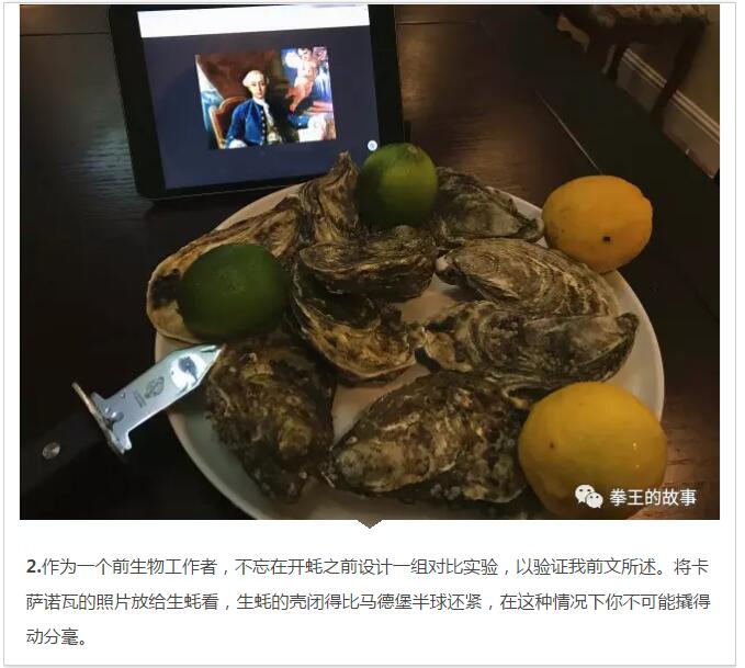 我曾經(jīng)做過一個實驗,把卡薩諾瓦的畫像放在一盤生蠔面前,然后用有道詞典里的意大利語發(fā)音反復(fù)播放“Giacomo Girolamo Casanova”,這盤生蠔當(dāng)時就怒了,以至于我把他們放到烤箱里烤了20分鐘都無法將殼撬開。—–在殺父之仇面前,生蠔們突破了自己的生理極限。