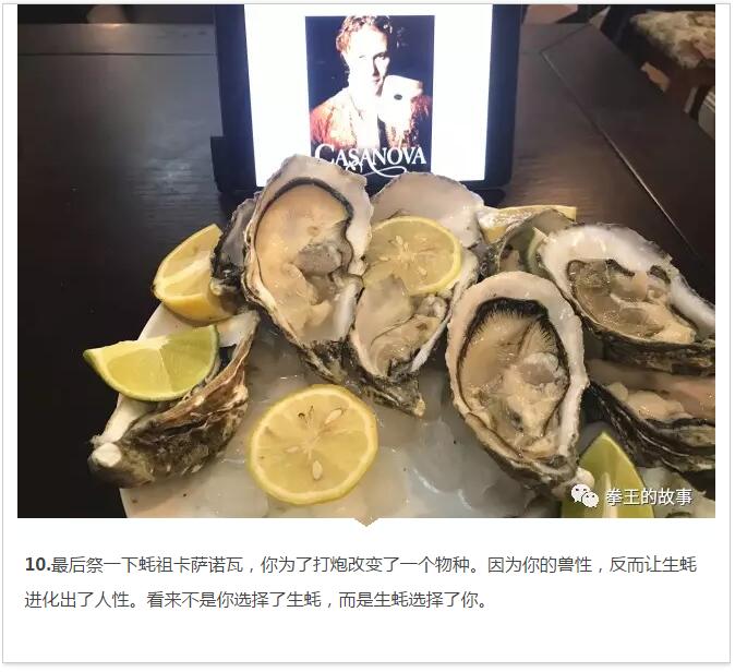 我頓時有點討厭卡薩諾瓦這個人,你說你亂搞就亂搞吧,為啥對生蠔這么狠,害得現(xiàn)在人類和生蠔搞這么僵。我對18世紀(jì)之前的那個田園時代悠然神往,那時候沒有喊麥、沒有霧霾,開生蠔也沒這么費力。