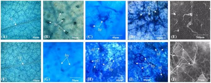 Ontario 792和Moneymaker葉片中C. fulvum的侵染過程如圖1所示。在Ontario 792葉片中,在9 dpi中出現(xiàn)少量的HR區(qū)域,在16 dpi 才開始顯著擴大,且沒有菌絲萌發(fā)。在Moneymaker中,菌絲萌發(fā),壞死灶在9 ~ 16 dpi的葉片中持續(xù)增加,并覆蓋葉片表面。