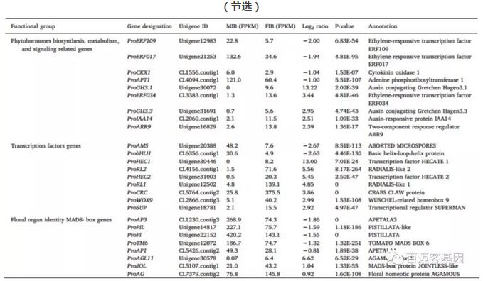植物調(diào)控網(wǎng)絡(luò)中,轉(zhuǎn)錄因子有著舉足輕重的地位。結(jié)合轉(zhuǎn)錄因子預(yù)測(cè)和差異基因分析,發(fā)現(xiàn)了一批可能調(diào)控性別發(fā)育的轉(zhuǎn)錄因子。比如編碼PvoAMS和PvobHLH的基因分別下調(diào)了5.4和5.2倍,編碼PvoWOX9和PvoSUP 的基因在FIB中上調(diào)。由此可見,生長(zhǎng)素、細(xì)胞分裂素、生長(zhǎng)素能夠促進(jìn)花的性別分化為雌性,激素之間的相互作用和內(nèi)部穩(wěn)態(tài)平衡對(duì)花性別分化至關(guān)重要。
