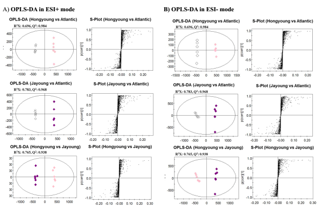 在正和負(fù)模式下的正交偏最小二乘判別分析(OPLS-DA)的分?jǐn)?shù)圖和散點(diǎn)圖