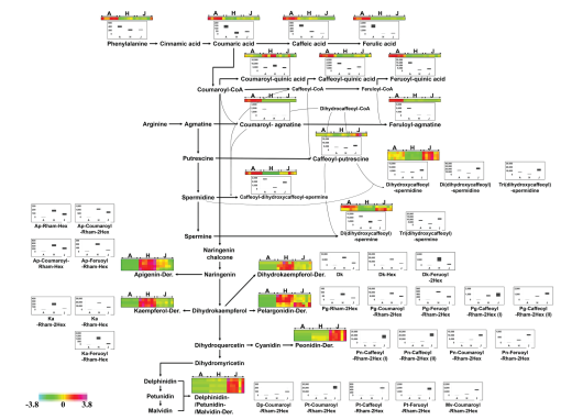 花青素是苯丙素通路中類黃酮合成的花色素苷的?;擒?。據(jù)報(bào)道,花青素衍生物飛燕草色素(Dp),芍藥色素(Pn)和錦葵色素(Mv)是紫色和深色的色素來(lái)源,而花青色素(Cy)和花葵素(Pg)的衍生物是亮紅色果實(shí)中的主要色素。結(jié)果顯示,Hongyoung與Jayoung在苯丙素合成途徑下游的黃酮類組分差異顯著,表明這些代謝物可能是造成馬鈴薯品種間色澤差異的關(guān)鍵因素。Hongyoung中芹黃素、山柰酚、二氫山柰酚和天竺葵色素衍生物的含量較高,而Jayoung中芍藥花青素、牽牛花色素、飛燕草色素和錦葵色素衍生物積累較多。
