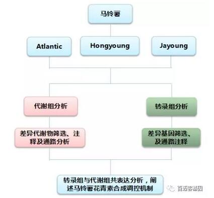 1.本研究對(duì)三個(gè)不同品種的馬鈴薯樣品同時(shí)做轉(zhuǎn)錄組和代謝組,首先通過(guò)代謝組分析不同馬鈴薯品種與色澤合成的差異代謝物,然后采用轉(zhuǎn)錄組,篩選與色澤合成相關(guān)的類黃酮代謝、植物激素、信號(hào)通路、轉(zhuǎn)錄因子相關(guān)的差異基因,最后將色澤合成相關(guān)的差異代謝物和差異基因做關(guān)聯(lián)分析,挖掘馬鈴薯色澤的調(diào)控網(wǎng)絡(luò)。