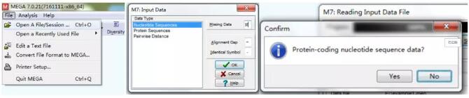 File — Open A File/Session — 選擇要導(dǎo)入的文件,選擇數(shù)據(jù)類型(如果是SNP即為Nuceotide Sequences),提示Protein-coding nucleotide sequence data時,選擇No,即不把DNA序列翻譯成蛋白序列構(gòu)建進(jìn)化樹,如圖5。
