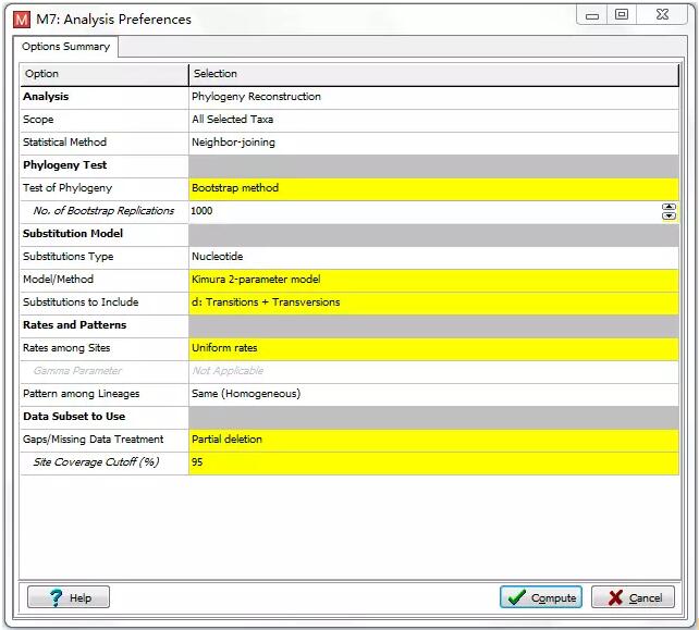 參數(shù)設(shè)置,主要填寫B(tài)ootstrap值,一般選擇500或1000次;Model一般用Kimura 2-parameter Model(K2),如果K2模型運(yùn)行不了,可以換成p-distance模型;Gaps/Missing Data Treatment選擇Partial deletion或者pairwise deletion,選擇complete deletion時帶有缺失值的標(biāo)記都會被刪除,所以必須謹(jǐn)慎;Site Coverage Cutoff與我們常說的完整度相同,一般填寫成我們過濾標(biāo)記時使用的完整度,上述參數(shù)設(shè)置完成后,點(diǎn)擊compute即可。(見圖6)