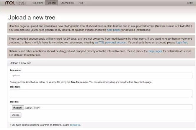 1、打開iTOL主頁以后,選擇上端的Upload選項,出現(xiàn)輸入界面后,可以在Tree text框中粘貼nwk中的內(nèi)容,也可以通過【選擇文件】選項選擇需要展示的進(jìn)化樹,之后點(diǎn)擊Upload即可。