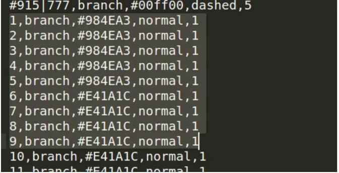 2、進(jìn)化樹著色,按照iTOL的要求,填寫一個顏色配置文件,填寫方法如該鏈接的說明https://itol.embl.de/help/colors_styles_template.txt,給末端分枝著色的配置文件填寫如下圖,[2,branch,#984EA3,normal,1]中2為樣本ID,branch表示給樹枝上色,#984EA3為16進(jìn)制顏色代碼,normal表示線條的樣式為正常的實線,1表示枝條的大小為1,該文件必須以.txt結(jié)尾,填寫完成后,將其拖入進(jìn)化樹的界面即可。