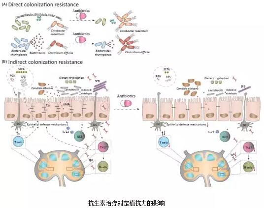 抗生素治療帶來(lái)不良影響的原因多種多樣。首先,它可能破壞微生物之間以及微生物與宿主之間的相互作用,而這些互作是維持人體生態(tài)體系內(nèi)穩(wěn)態(tài)的關(guān)鍵。其次,它還可能促進(jìn)抗生素耐藥菌的增長(zhǎng),及導(dǎo)致其它敏感型細(xì)菌獲得抗生素耐藥性。這些機(jī)制可能導(dǎo)致微生物菌群組成的不可逆改變。最后,因抗生素使用過(guò)度減少了共生細(xì)菌對(duì)免疫系統(tǒng)的刺激,可能會(huì)破壞免疫系統(tǒng)的適當(dāng)“education”,從而產(chǎn)生對(duì)自身或無(wú)害抗原的免疫反應(yīng),即發(fā)生自身免疫反應(yīng)或過(guò)敏反應(yīng)。