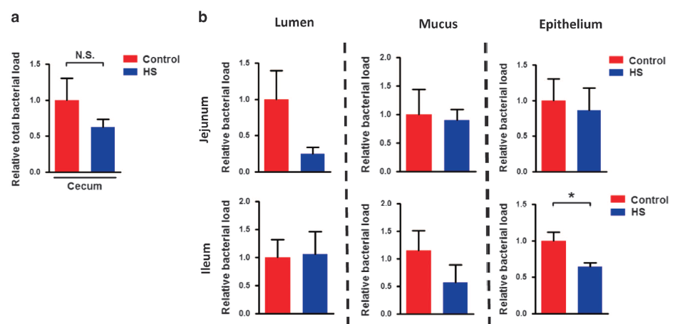 慢性高鹽HS喂養(yǎng)后,盲腸中的總細(xì)菌負(fù)荷略微降低。分離不同部位的菌群,慢性HS喂養(yǎng)后,回腸上皮和結(jié)腸腔內(nèi)的細(xì)菌負(fù)荷也降低。
