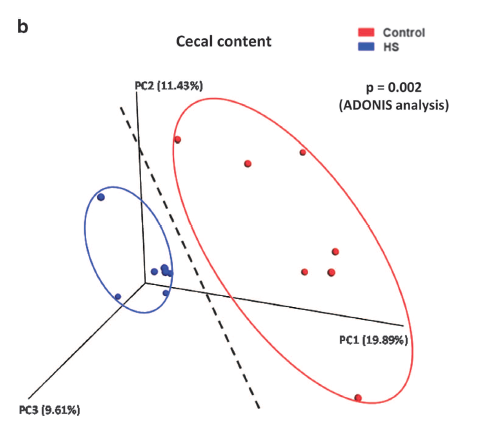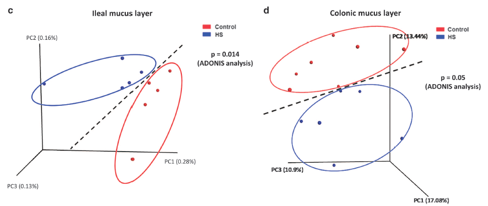 16S rRNA測(cè)序表明, HS組的盲腸內(nèi)容物(cecal content)菌群組成與對(duì)照小鼠相比,在門和綱水平上明顯不同。特別是在HS處理后,盲腸內(nèi)容物中放線菌門和厚壁菌門中的Actinobacteria、Firmicutes和Bacteroidetes以及綱水平中的Actinobacteria,Clostridia和Bacteroidia所占比例顯著改變。使用未加權(quán)的uniFrac分析的主坐標(biāo)分析(PCoA)顯示,HS組和對(duì)照組盲腸內(nèi)容物菌群分別聚類(P = 0.002,ADONIS分析)。粘膜細(xì)菌也是影響腸道病理生理狀態(tài)的重要因素,回腸粘膜( ileal mucosa)和結(jié)腸粘膜(colonic mucosa)在整個(gè)胃腸道中的細(xì)菌數(shù)量最多。因此,進(jìn)一步分析了位于回腸粘膜層和結(jié)腸粘膜層的細(xì)菌。未加權(quán)的uniFrac分析顯示,HS組和對(duì)照組在回腸粘液層分別聚類(P = 0.014,ADONIS分析)。而在結(jié)腸粘液層,對(duì)照組和HS組也形成兩個(gè)聚類類別,分離趨勢(shì)明顯(P =0.05,ADONIS分析)。