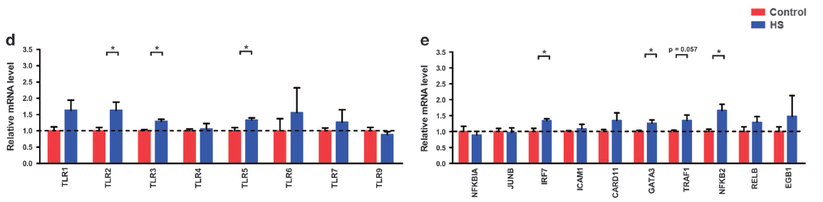 通過二代測(cè)序進(jìn)行轉(zhuǎn)錄組測(cè)序分析,比較對(duì)照組和HS組之間涉及“細(xì)胞因子-細(xì)胞因子受體相互作用”、“NF-κB信號(hào)通路”和“Toll樣受體信號(hào)通路”的所有相關(guān)基因的表達(dá)。結(jié)果表明回腸和結(jié)腸中,兩組之間許多基因的表達(dá)存在差異。