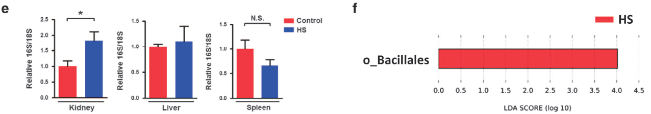 腸道通透性增加可能導(dǎo)致腸道細(xì)菌或細(xì)菌產(chǎn)物易位至腸外組織。通過使用16s PCR來識(shí)別細(xì)菌DNA,檢測(cè)腎臟、肝臟和脾臟中的細(xì)菌易位。有趣的是,慢性HS攝入促進(jìn)了細(xì)菌易位進(jìn)入腎臟,但不會(huì)進(jìn)入肝臟或脾臟。LEfSe試驗(yàn)結(jié)果表明,與對(duì)照組相比,HS處理的腎臟中富含屬于腸道細(xì)菌的桿菌。與對(duì)照動(dòng)物的腎臟相比,在HS喂養(yǎng)的腎臟中,芽孢桿菌(Bacillus)和游動(dòng)微菌(Planomicrobium)分別增加了2.6倍和8.7倍。