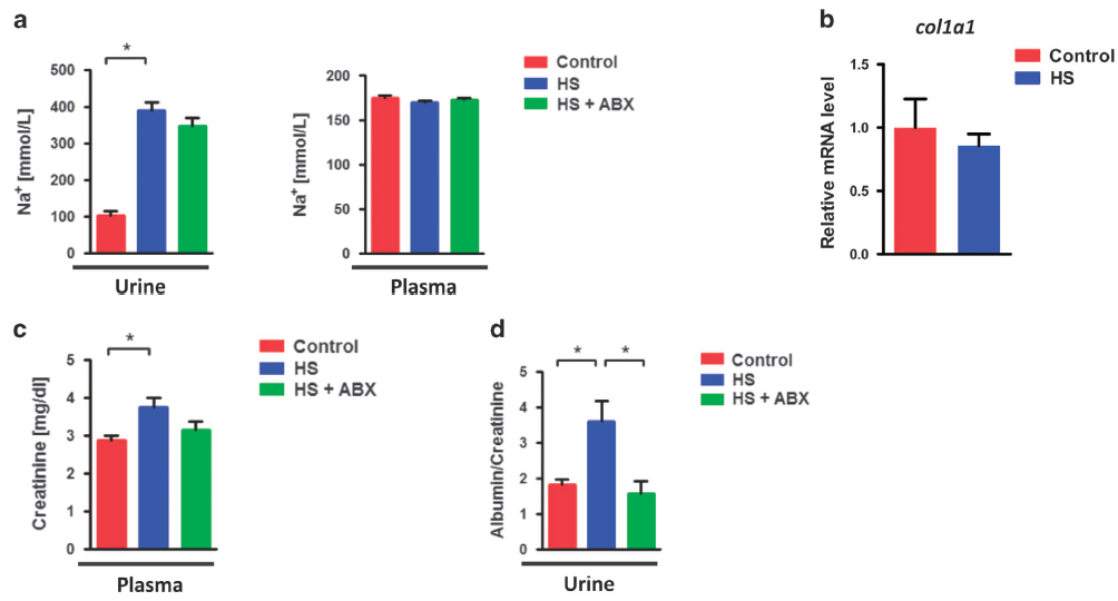 給予小鼠抗生素(多粘菌素B和新霉素,antibiotics,ABX)處理后,恢復(fù)了HS喂養(yǎng)誘導(dǎo)的回腸IFN-γ的過表達(dá)和腸道滲漏。通過尿和血漿Na +濃度測(cè)量,發(fā)現(xiàn)抗生素并不改變鈉負(fù)荷。HS喂養(yǎng)增加了血漿肌酐(creatinine)水平,與HS治療相比,抗生素治療后具有較低但不顯著的血漿肌酐水平。HS喂養(yǎng)小鼠的腎功能障礙主要標(biāo)志物–尿白蛋白/肌酐比率顯著增加,但抗生素治療幾乎可以完全恢復(fù)腎功能??股厥┯眠€可以降低HS誘導(dǎo)的凋亡細(xì)胞升高。以上結(jié)果表明,抗生素治療能夠改善HS喂養(yǎng)引起的腸道滲漏和早期腎損傷。