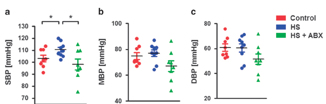 慢性HS喂養(yǎng)可能導(dǎo)致動(dòng)脈壓升高。 雖然HS處理的小鼠的舒張壓(DBP)和平均血壓沒有增加,但收縮壓(SBP)在慢性HS喂養(yǎng)后顯著升高。有趣的是,抗生素治療能夠完全恢復(fù)正常SBP。這些數(shù)據(jù)強(qiáng)烈表明,慢性HS喂養(yǎng)引起的SBP升高取決于腸道微生物菌群。