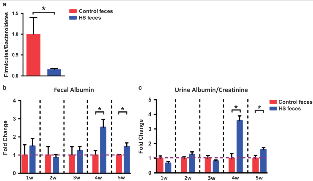 糞便微生物菌群移植實(shí)驗(yàn):喂食正常飲食的兩組小鼠口服來自對(duì)照和HS處理的小鼠的糞便。移植8周后,接受對(duì)照糞便的對(duì)照小鼠中的微生物菌群組成改變的主要標(biāo)記物–盲腸厚壁菌/擬桿菌比例明顯高于接受HS糞便的小鼠,這一點(diǎn)與作者之前的數(shù)據(jù)一致,表明HS喂養(yǎng)會(huì)降低盲腸中的厚壁菌 / 擬桿菌比例,并說明了糞便微生物菌群移植實(shí)驗(yàn)是成功的。給藥4周后,糞便白蛋白含量檢測(cè)結(jié)果表明,接受HS喂養(yǎng)糞便的小鼠的腸通透性顯著增加。并且,尿白蛋白(albumin)/肌酸酐(creatinine)比率(在當(dāng)前研究中觀察到的腎功能障礙的主要表型),在移植4周后接受HS喂養(yǎng)的糞便的小鼠中也顯著增加。最后,與對(duì)照小鼠相比,HS糞便移植小鼠中的腎臟凋亡細(xì)胞數(shù)量顯著增加。