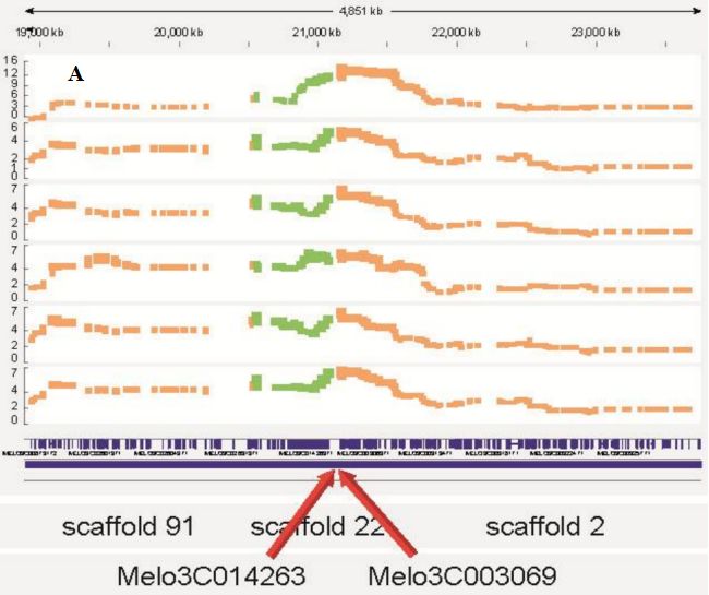 轉(zhuǎn)錄組測(cè)序:授粉10-20天,每個(gè)line取5株甜瓜的果肉混樣提取RNA,Illumina GAII和HiSeq 2000測(cè)序
