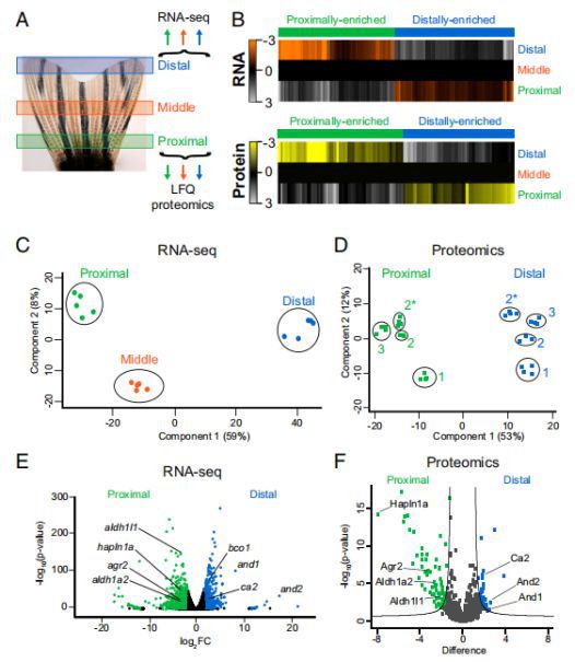 ????????為了鑒定可能參與尾鰭位置記憶的候選分子,本研究對(duì)未受傷的斑馬魚尾鰭的近端,中間和遠(yuǎn)端區(qū)域進(jìn)行了RNA測(cè)序(RNA-seq)和無標(biāo)記定量(LFQ)蛋白質(zhì)組學(xué)(圖1A),共鑒定出566個(gè)轉(zhuǎn)錄本和238個(gè)蛋白質(zhì),主要存在于近或遠(yuǎn)的富集梯度中(圖1B)。另外,主成分分析(PCA)顯示鰭的近端和遠(yuǎn)端區(qū)域之間的轉(zhuǎn)錄物(圖1C)和蛋白質(zhì)(圖1D)豐度的變化很大。中間區(qū)域的轉(zhuǎn)錄本聚集成一個(gè)獨(dú)特的組,但更接近于遠(yuǎn)端區(qū)域(圖1C)。差異豐富分子的最大差異發(fā)生在近端和遠(yuǎn)端區(qū)域之間,包括1,424個(gè)轉(zhuǎn)錄本和113個(gè)蛋白質(zhì)(圖1E)。因此,基因組的表達(dá)在整個(gè)尾鰭的近遠(yuǎn)端軸上存在著定量的差異。