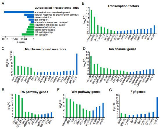 為了確定沿尾鰭近遠(yuǎn)端軸線差異表達(dá)的分子類型,因此對(duì)RNA-seq數(shù)據(jù)進(jìn)行了GO分析(圖2A)。轉(zhuǎn)錄因子是細(xì)胞識(shí)別的主要監(jiān)管者,因此是位置記憶效應(yīng)物的最佳候選者。在作者的RNA-seq數(shù)據(jù)中編碼轉(zhuǎn)錄因子的693個(gè)mRNA中,有53個(gè)在尾鰭前緣和末端區(qū)域差異表達(dá)(圖2B)。對(duì)應(yīng)于964個(gè)跨膜受體中的80個(gè)和222個(gè)離子通道蛋白中的55個(gè)的RNAs在近端和遠(yuǎn)端區(qū)域之間差異表達(dá)。這些命中包括谷氨酸和多巴胺可吸收G蛋白偶聯(lián)受體和幾個(gè)Ca2+和K+可滲透通道(圖2C和D)。此外,作者發(fā)現(xiàn)與先前不涉及生長控制或再生的細(xì)胞信號(hào)傳導(dǎo)途徑相關(guān)的跨膜蛋白的差異表達(dá),如ephrin和ednrab。RA,WNT和FGF信號(hào)傳導(dǎo)等幾種途徑在附肢發(fā)育和再生期間已知在生長控制和圖案化中的作用,這些信號(hào)通路分別包含55,52和41個(gè)基因,并確定了12個(gè)RA,13個(gè)WNT和10個(gè)FGF信號(hào)傳導(dǎo)途徑基因相反的轉(zhuǎn)錄梯度(圖2E-G)。