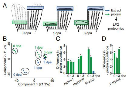 為了檢驗(yàn)這種預(yù)測(cè),分別于截肢后1、3天(dpa),在blastema形成期和生長期(圖4A)對(duì)再生鰭的片段進(jìn)行LFQ蛋白質(zhì)組學(xué)研究。為了減少魚類之間的潛在變異,作者從同一條魚中采集了再生鰭的背側(cè)和腹遠(yuǎn)端區(qū)域(雙截肢)。作者發(fā)現(xiàn)3061種蛋白質(zhì)中有97種、11種和2種在0,1和3dpa的背側(cè)和腹側(cè)-遠(yuǎn)側(cè)位置之間差異表達(dá)。在再生過程中不同時(shí)間蛋白質(zhì)表達(dá)的PCA顯示1和3dpa的樣品聚集成不同的組,在近端或遠(yuǎn)端區(qū)域之間幾乎沒有變化,而在未損傷的鰭(0dpa)中近端和遠(yuǎn)端區(qū)域之間存在更多變異(圖4B)。然而,在1dpa差異表達(dá)的11種蛋白中,6種在未受損魚鰭(0dpa)中也差異表達(dá)。編碼這些蛋白質(zhì)的三個(gè)基因aldh1l1,hsd17b7和muc5.2(圖4C)也通過RNA-seq測(cè)量發(fā)現(xiàn)在未受傷的鰭片中差異表達(dá)。UniProt ID F1R4E4的一種無特征蛋白質(zhì),是唯一在0,1和3dpa差異表達(dá)的蛋白質(zhì)(圖4D)。